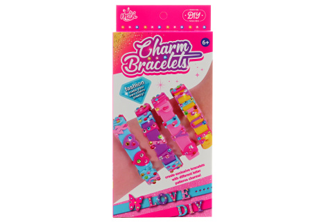 Kreativní sada - výroba náramků. Sada obsahuje 4 gumové náramky, 4 tabulky s písmeny a znaky a 2 archy s ozdobnými kamínky. Baleno v krabičce. Rozměry balení 11x23x3 cm. Věk 3+ (doporučený věk 6+)