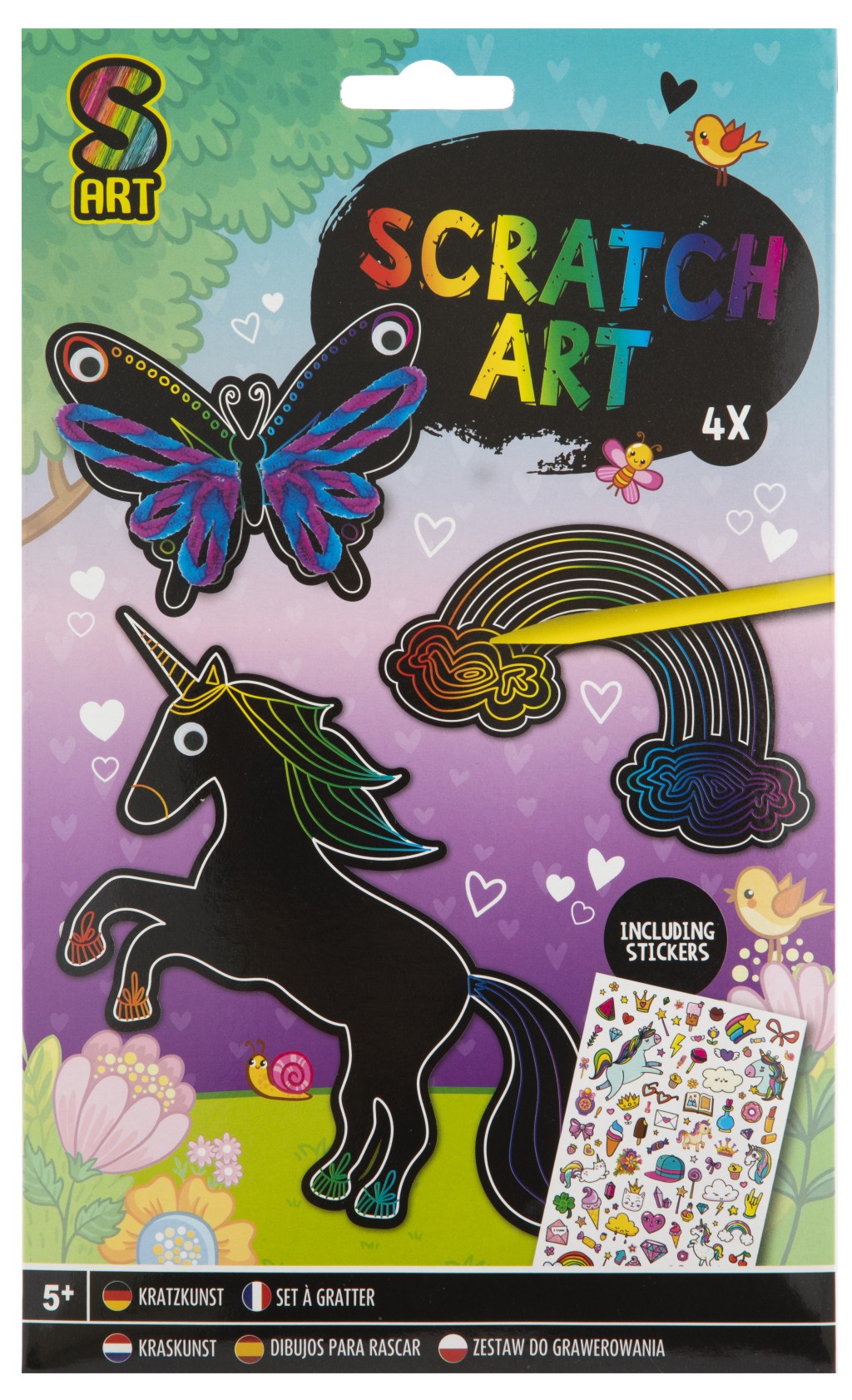 Vyškrabávací obrázky se samolepkami – zvířátka – balení obsahuje 4 obrázky zvířátek + samolepky